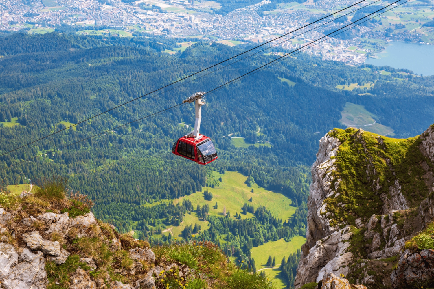 Von dort geht's weiter nach Kriens, wo wir mit der Gondel aufsteigen. Wenn du dich über den Wald und die Hügel erhebst, wird die Landschaft von Minute zu Minute beeindruckender. Der erste Halt ist Fräkmüntegg, ein spektakulärer Aussichtspunkt, wo du auch die aufregende Rodelbahn genießen kannst. Diese Aktivität ist nur bei gutem Wetter verfügbar und kostet 9 CHF pro Fahrt.