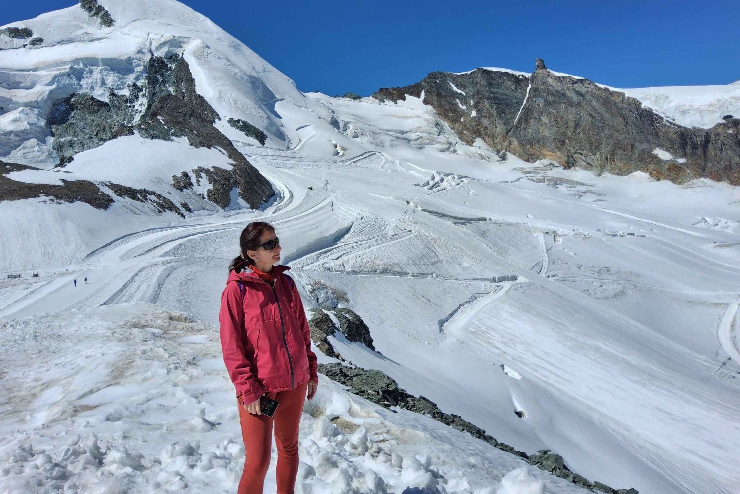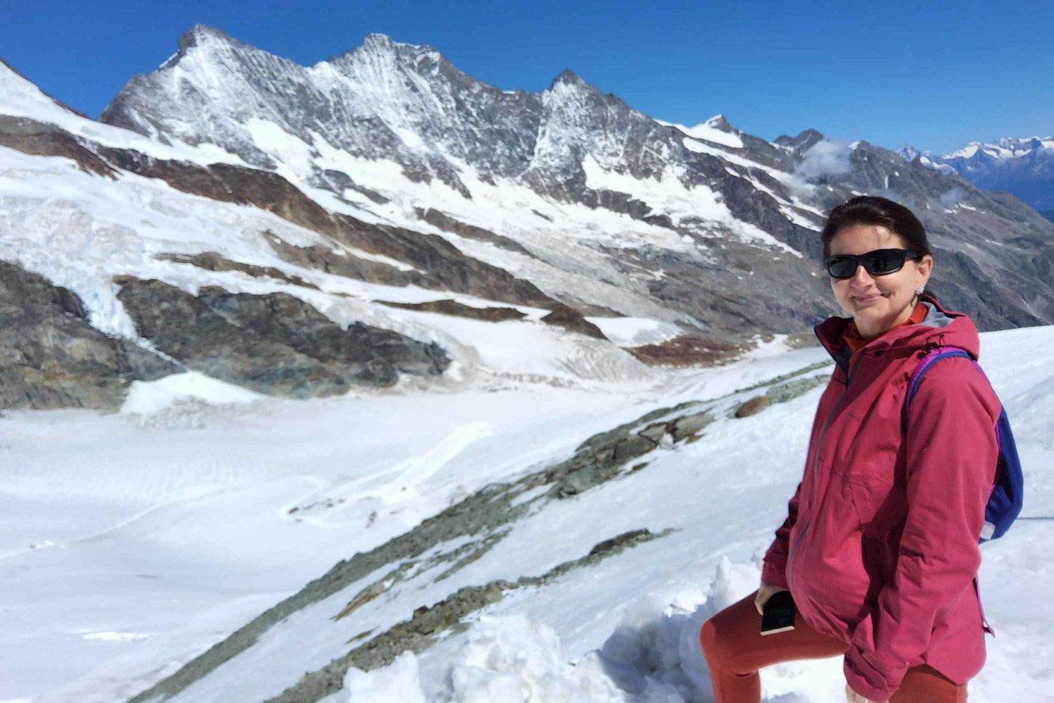 Genieße eine malerische Zug- und Busfahrt vom Flughafen Zürich nach Saas-Fee und erkunde dann Mittelallalin auf 3.500 m Höhe, wo sich das höchstgelegene Drehrestaurant der Welt und die Metro Alpin befinden.