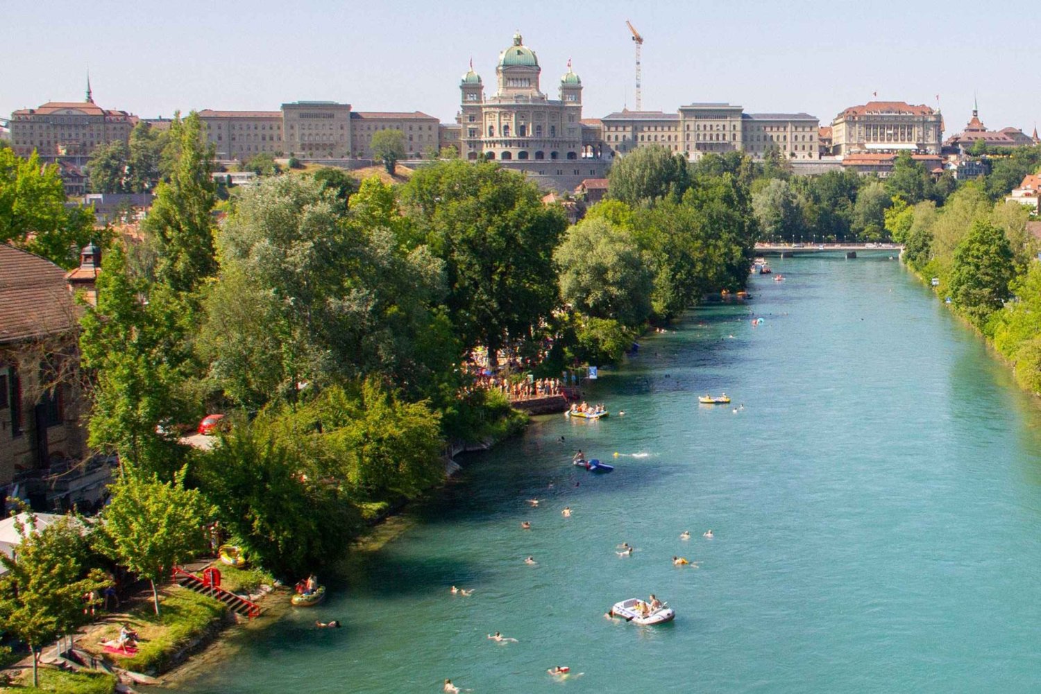 Deja atrás la ciudad y sumérgete en una de las tradiciones veraniegas favoritas de Suiza: flotar por el río Aar como un local.